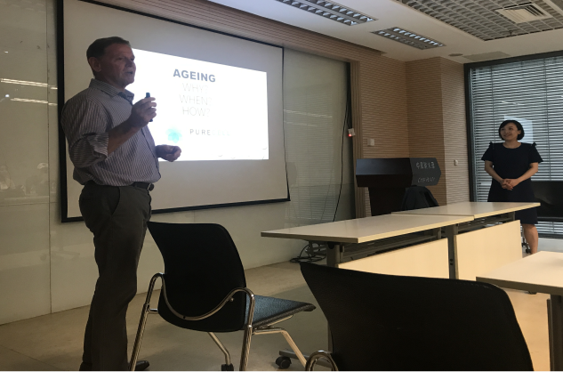 中青旅耀悅集團宋軒先生開場為大家介紹此次活動流程。由PURECELL集團董事局主席Dr Peter Britton向大家介紹人為什麼會衰老及如何預防衰老。科學研究發現人的一切衰老都是由於體內干細胞數量減少,細胞無法得到修復從而出現故障引起的。若是能將干細胞激活來修復細胞,則就能讓肌膚重新變得更有彈性,讓身體重新變得年輕。